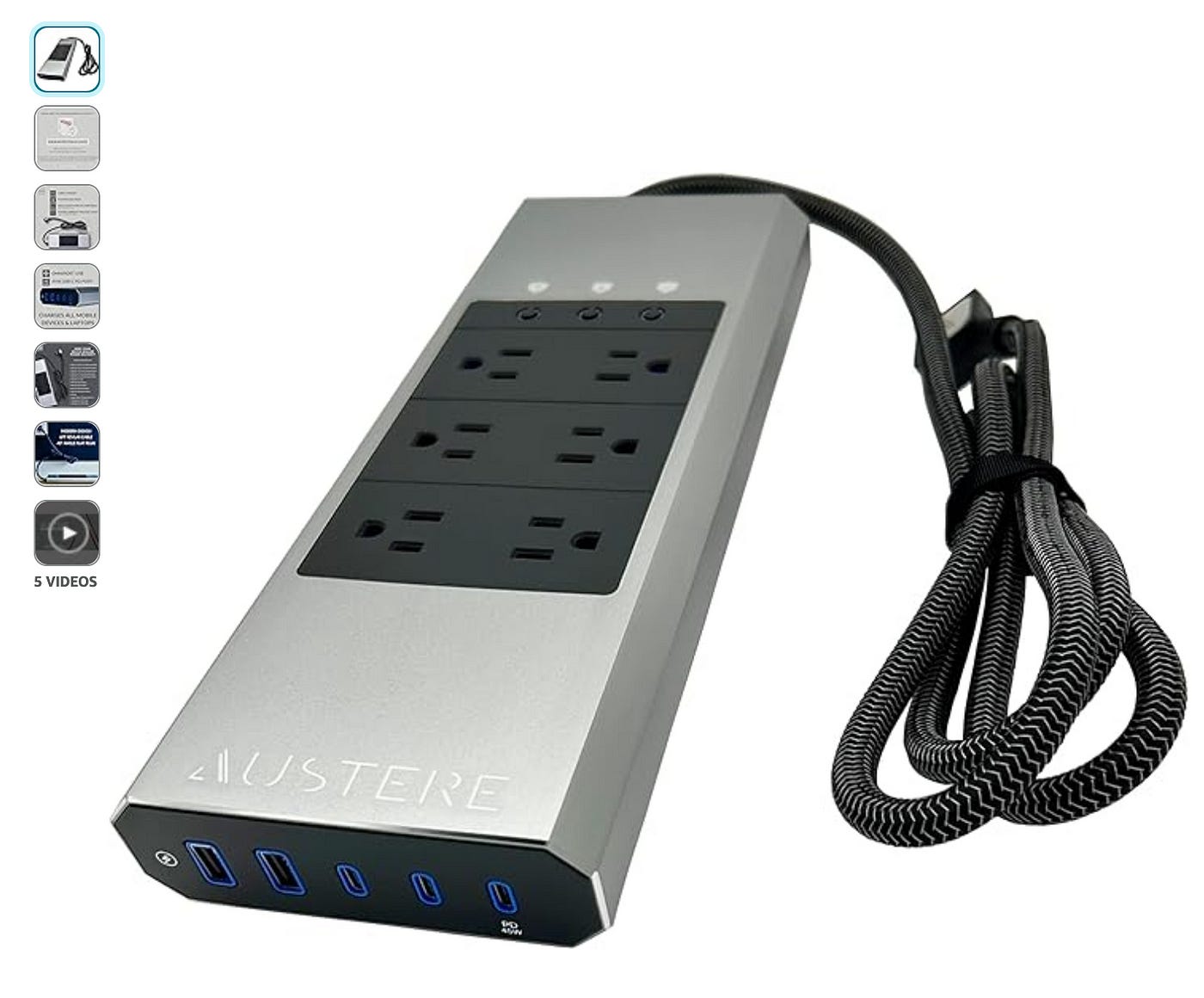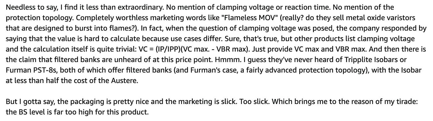 Another rule of thumb is: never judge on price or materials alone. Here is an example of a review from user PandaMaster on Amazon critisizing the Austere VII Series Surge Protector Power Strip, 6 Wide Outlets, 3 USB C & 2 USB A 2.4 amp Ports, 45W Power Delivery. This one is higher priced (ca $200) and features a heavy duty metal case.