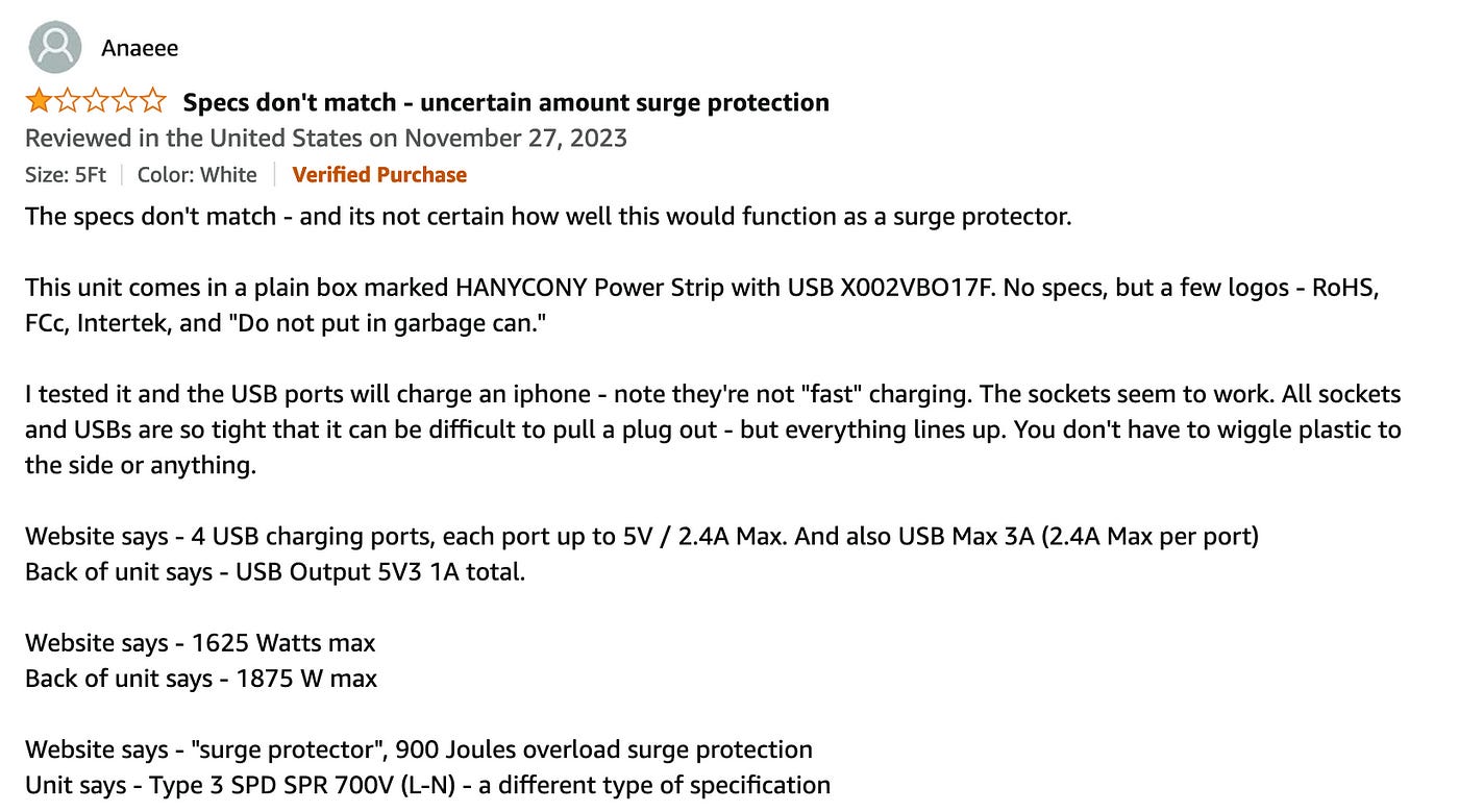 Always read the negative reviews first, and rank them higher than positive ones. In this case user Anaeee on Amazon reported different specs, and no surge protection.