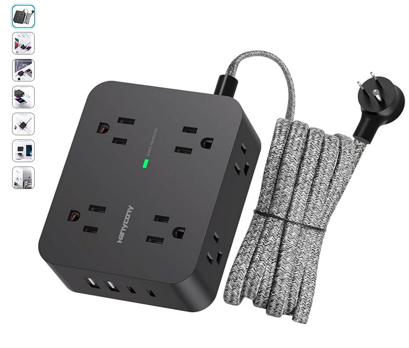 Here is an example of a power strip with USB plugs — which is very popular on Amazon. You have to be very careful with these! Always read the specifications. For this specific one: USB A ports (5V/2.4A) and USB C ports (5V/3A) max for each port. (3.4A/17W in total — which can be considered “fast charging”). I do not recommend any of these power strips at all!