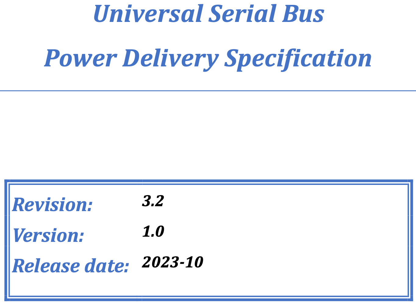 The USB Power Delivery specification is available from usb.org, and is currently available in version 3.2 (10/31/2023) with the complete title USB PD R3.2 V1.0. The contributor list is impressive (see page 3 of the spec document), and lists companies such as Apple, Foxconn, HP, Huawei, Infineon, NXP, Samsung, Seagate, Texas Instruments, Western Digital, and many others.